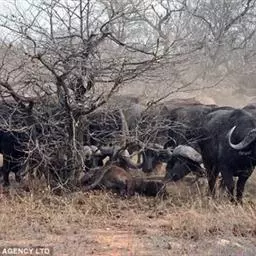 非洲野水牛群体中,雌性之间的合作是强大的,如果有成员被狮子等食肉动物袭击,那么其余的群体将对其咆哮的求救呼喊作出反应,并且匆忙地进行防御。一群野水牛很容易驱走整个狮群,以保护整个畜群成员的安全。森林野水牛生活的族群大小并不重要,因为它们栖息在一个不适合食肉动物(如狮子)的栖息地中,如果需要的话,森林野水牛可以很容易地进入隐蔽处。