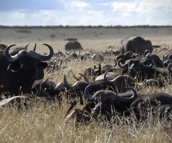 非洲野水牛(学名:Syncerus caffer):共有5个亚种。头体长2.1-3.4米,身高1-1.7米,体重300-900千克。胸膛宽阔,四肢粗壮,头大角长,雄性的角从头部向外和向下扩散,在一些雄性中,角通过覆盖头部的大盾连接。头顶的柔软的毛发附着在大而下垂的耳朵上。身体通常覆盖着稀疏的毛发,通常从棕色到黑色。长尾巴,尾尖处有毛发流苏。雄性个体大于雌性,角也更大更长更厚。而热带草原的种群的体型可以达到森林栖息地的物种的两倍。