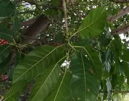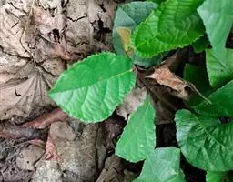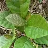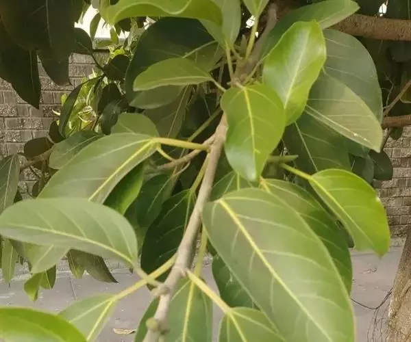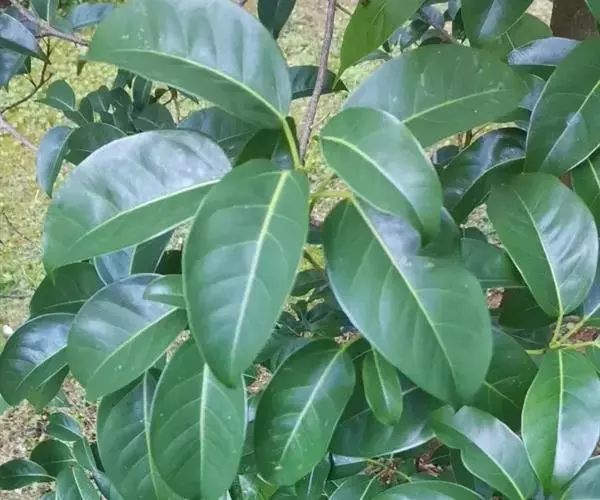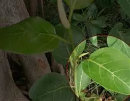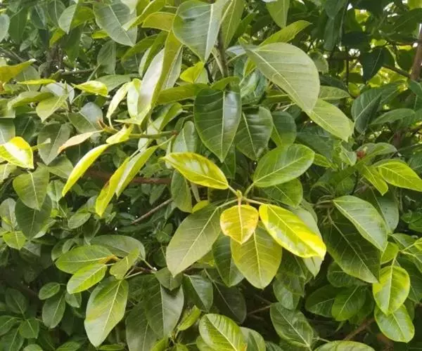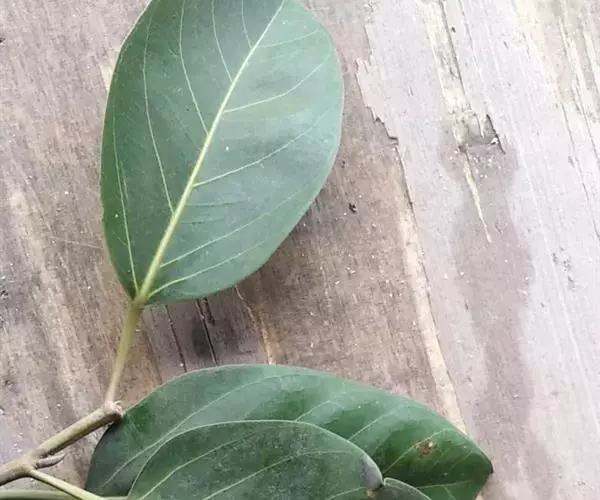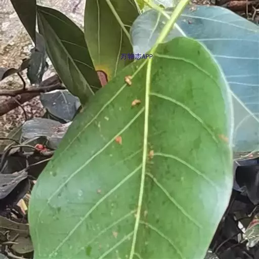 叶厚革质,广卵形至广卵状椭圆形,长10-19厘米,宽8-11厘米,先端钝,急尖,基部宽楔形,全缘,两面光滑,无毛,基生侧脉延长,侧脉5-7对;叶柄长2-5厘米,粗壮;托叶厚革质,长2-3厘米,外面被灰色绢丝状毛。
