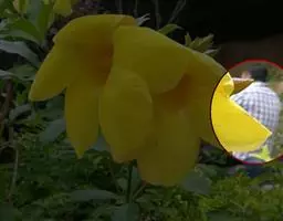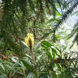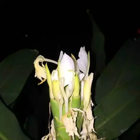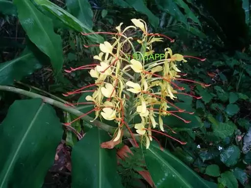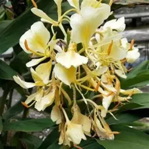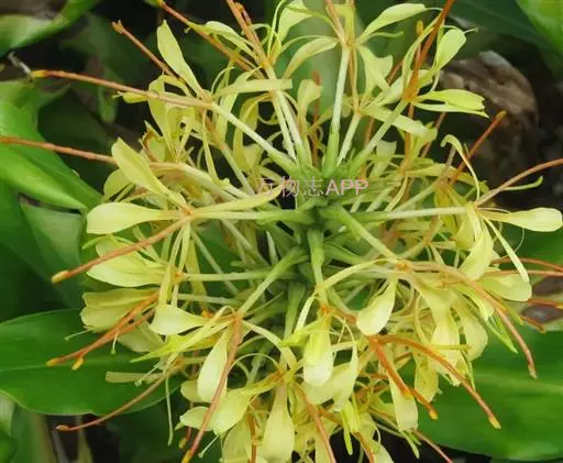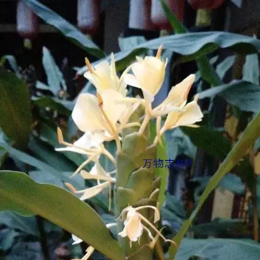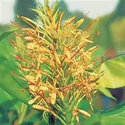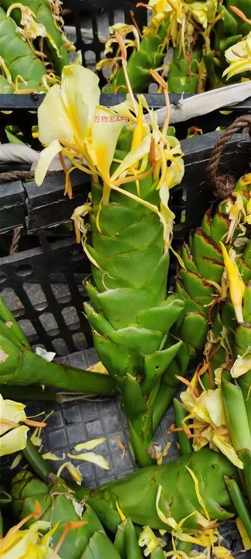 黄姜花(学名:Hedychium flavum Roxb.):姜科,姜花属多年生草本草本芳香花卉,秋冬季开花,穗状花序,长圆形;苞片长椭圆形,覆瓦状排列,每一苞片内有花3-5朵;花深黄色,形似蝴蝶,气味芬芳纯正,沁人心脾;唇瓣倒心形,黄色,当中有一个橙色的斑,顶端微凹,侧生退化雄蕊短瓣状;花朵由下至上依次开放,极为漂亮,自然栽培下,每个苞片可开花3-5朵,每支花期长约30天。