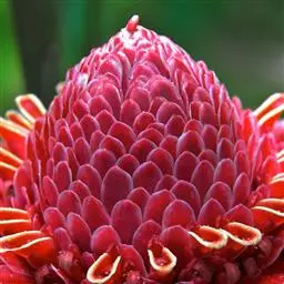 穗状花序长圆形,长约10厘米,宽约5厘米;苞片覆瓦状排列,长圆状卵形,长4-6厘米,宽1.5-3厘米,顶端边缘具髯毛,每一苞片内有花3朵;小苞片长约2厘米,内卷呈筒状;花黄色,花萼管长4厘米,外被粗长毛,顶端一侧开裂;花冠管较萼管略长,裂片线形,长约3厘米;侧生退化雄蕊倒披针形,长约3厘米,宽约8毫米;唇瓣倒心形,长约4厘米,宽约2.5厘米,黄色,当中有一个橙色的斑,顶端微凹,基部有短瓣柄;花丝长约3厘米,花药长1.2-1.5厘米,弯曲,柱头漏斗形,子房被长粗毛。花期:8-9月。