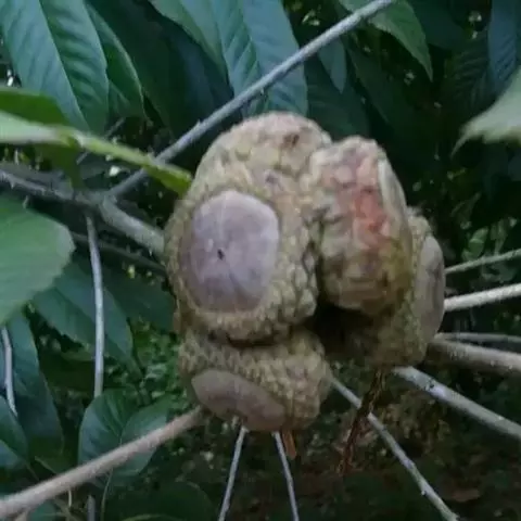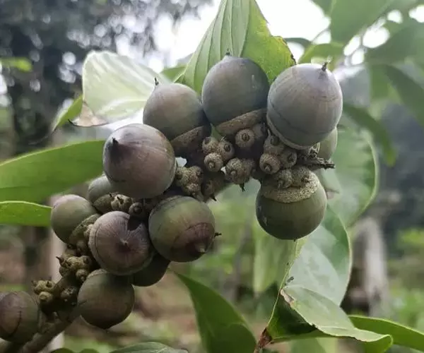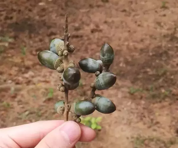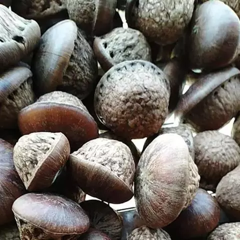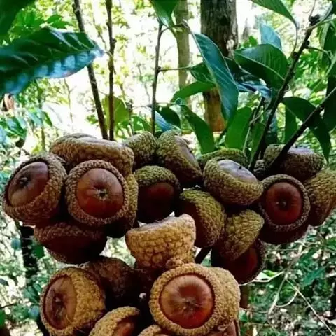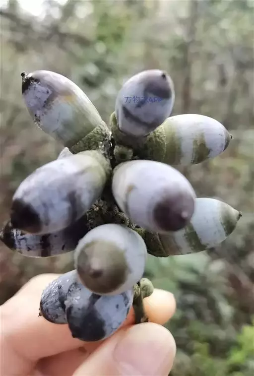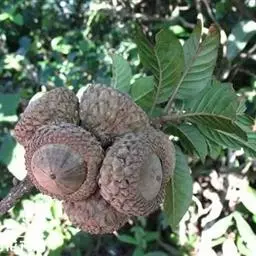 坚果椭圆形,高12-25毫米,宽8-15毫米,顶端尖,或长卵形,有淡薄的白色粉霜,暗栗褐色,果脐深达2毫米,口径3-5毫米,很少达8毫米。花期7-11月,果次年同期成熟。