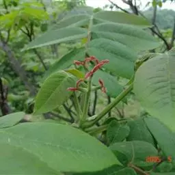 胡桃楸是胡桃科、胡桃属的乔木植物。株高可达20余米;茎皮灰色;叶椭圆形、长椭圆形、卵状椭圆形或长椭圆状披针形,具细锯齿,上面初疏被短柔毛,后仅中脉被毛,下面被平伏柔毛及星状毛;雄葇荑花序轴被短柔毛,雌穗状花序轴被茸毛;果序俯垂,果球形、卵圆形或椭圆状卵圆形,顶端尖,密被腺毛,果核棱间具不规则皱曲及凹穴,顶端具尖头;种仁较小;花期5月;果期8-9月。胡桃楸分布于中国黑龙江、吉林、辽宁、内蒙古、山西、河南、河北等省地,朝鲜、俄罗斯、日本等国家亦有分布。其喜温暖凉爽的生存环境,适宜在土层深厚、疏松肥沃、排水良好的黑垆土上栽培。一般繁殖方式为种子繁殖。胡桃楸具有止痛、敛肺定喘、温肾润肠、清热解毒等功效,可用于治疗胃痛、神经性皮炎、体质虚弱、肺虚咳嗽、肾虚腰痛、细菌性痢疾等症状。因其木材反张力小、不挠不裂,可作枪托、车轮、建筑等重要材料。