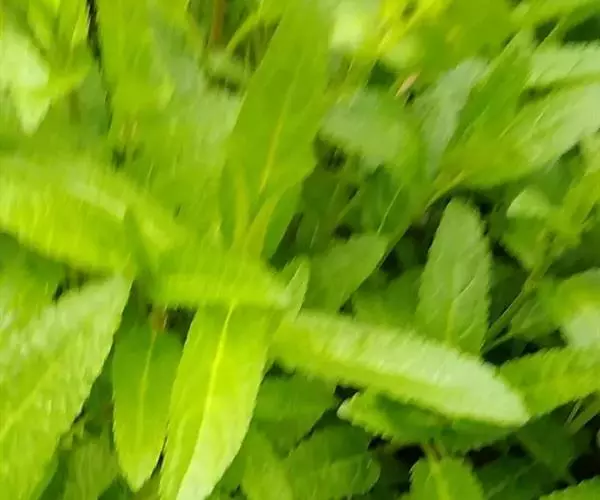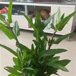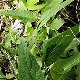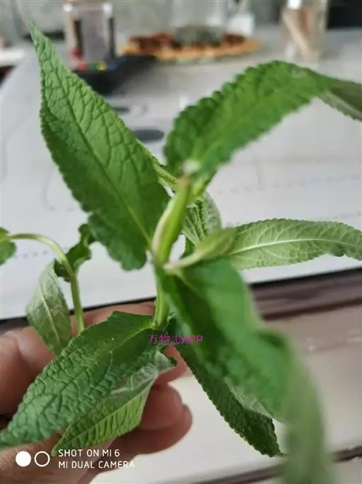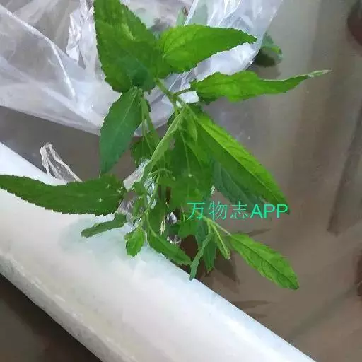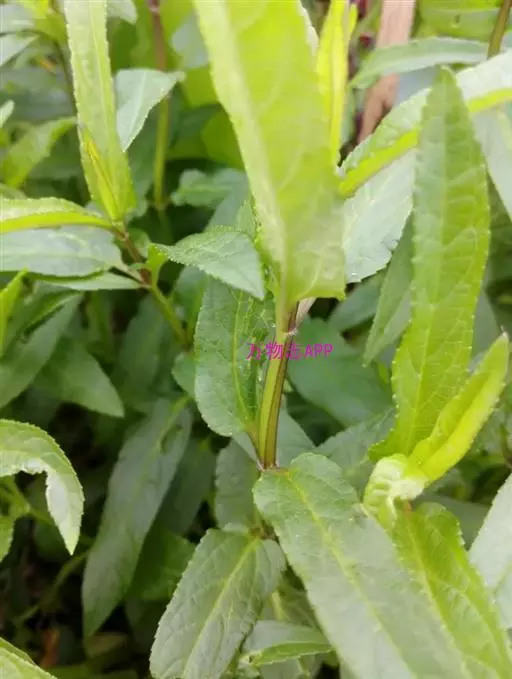 叶:茎叶长圆状宽披针形,长5-10厘米,宽1-2.3厘米,先端微急尖,基部圆形至微心形,边缘为圆齿状锯齿,上面绿色,下面灰绿色,两面均无毛,叶柄明显,长3-17毫米,近茎基部者最长,向上渐变短;苞叶披针形,无柄,近于全缘,向上渐变小,最下部者超出轮伞花序,上部者等于或短于轮伞花序。