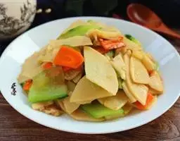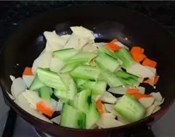 12、锅中上火少许油烧热,下入叉烧肉丁翻炒均匀,加水小火慢慢熬制至叉烧软烂。