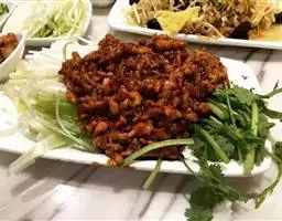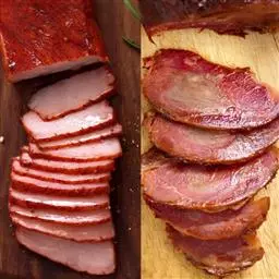 11、将五花叉烧肉、里脊叉烧1:1的比例切成小肉丁,调入2勺蚝油、1勺生抽。