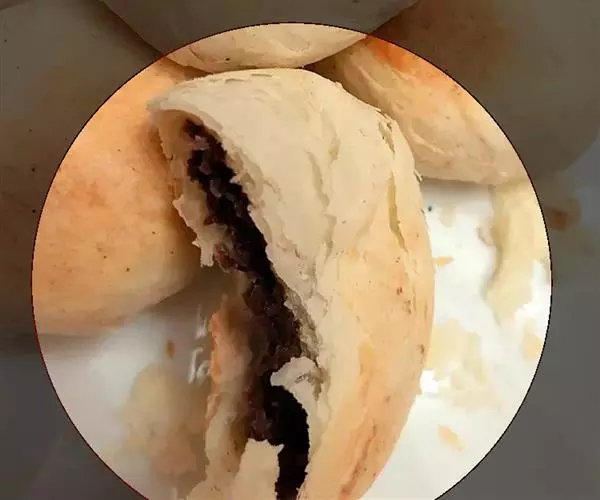 14、将面取出擀成薄片,压型后加入叉烧馅。