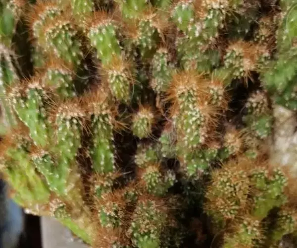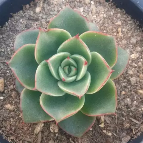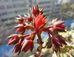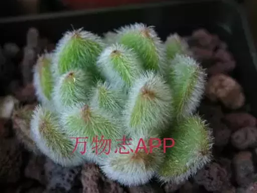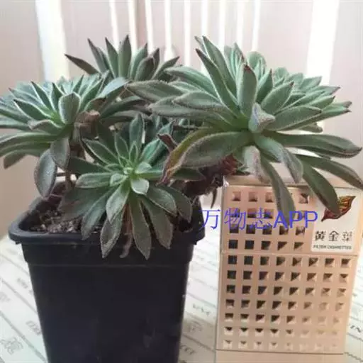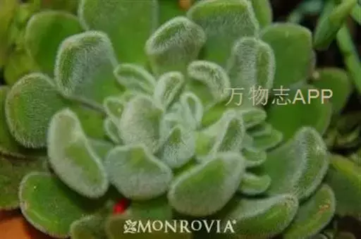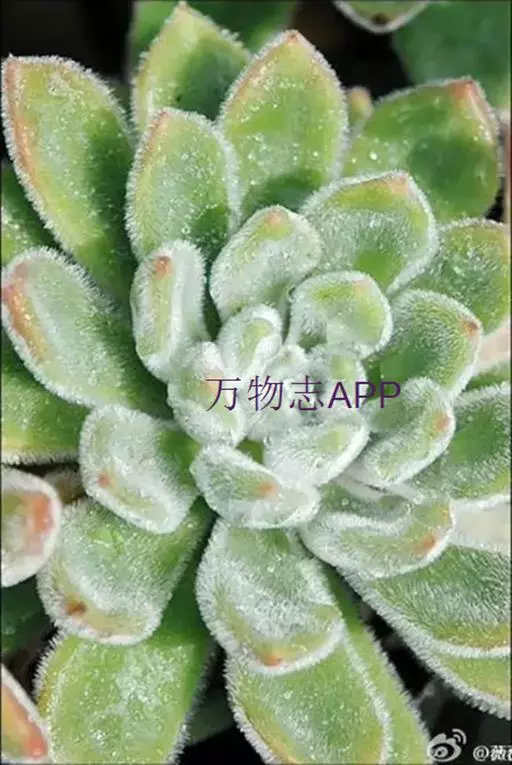 莲座叶盘无茎,老株易丛生。大的莲座叶盘由100片以上的叶组成。叶长5—7厘米、宽2厘米,基部狭窄,先端卵形并较厚,叶正面微凹、背面圆突,叶先端有微小的钝尖。叶绿色,叶端微呈红褐色,全叶被0.3厘米长的白毛。花序高20—30厘米,小花多,黄红色。本种形态有点像一种普遍栽培的同科属种类锦晃星,不同的是它没有高的茎,叶片比锦晃星厚,叶缘也没有锦晃星红。