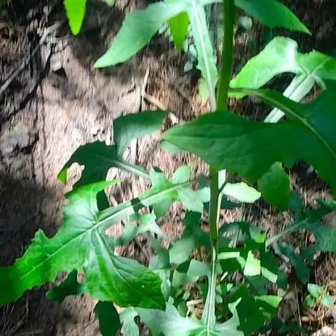 茎单生,有条棱,有长分枝或不分枝,全部茎枝被稀疏或下部稍稠密的多细胞长节毛,接头状花序下部的毛通常密厚。基部及下部茎叶长椭圆形或长倒披针形,长6-29厘米,宽2-7厘米,羽状浅裂、半裂或深裂,侧裂片6-12对,半椭圆形、偏斜半椭圆形或三角形,边缘有大小不等的钝三角形刺齿,齿顶及齿缘有黄白色针刺,齿顶针刺较长,长达3毫米,少有长5毫米的,或叶边缘有大锯齿,不呈明显的羽状分裂;向上叶渐小,与基部及下部茎叶同形并等样分裂,接头状花序下部的叶宽线形或线形,有时不裂。全部茎叶两面同色,绿色,沿脉有稀疏的多细胞长节毛,基部渐狭,两侧沿茎下延成茎翼。茎翼齿裂,齿顶及齿缘有长达3毫米的针刺,少有几达5毫米长的针刺,头状花序下部的茎翼有时为针刺状。
