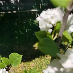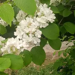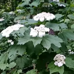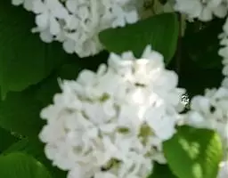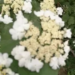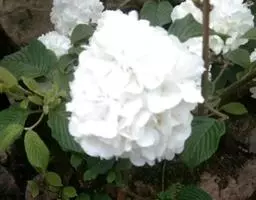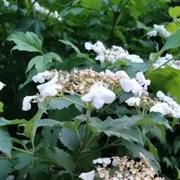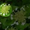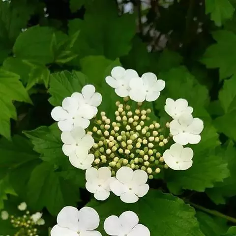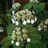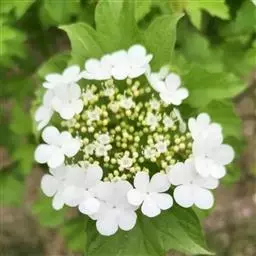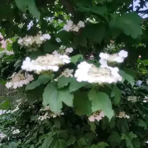 聚伞花序直径5~9厘米,花开后几无毛,周围有大型、白色的不孕花,无总花梗,第一级辐射枝常5条,花生于第三级辐射枝上,芳香;萼筒近圆球形,长约2毫米,萼齿卵圆形;花冠白色或带微红,辐状,直径5~6毫米,裂片卵形,长二倍于筒;雄蕊花药宽卵圆形,黄色;花柱不高出萼齿;不孕花直径2.5~3厘米,裂片倒卵形,常大小不等。