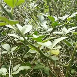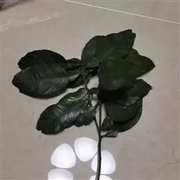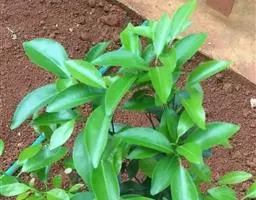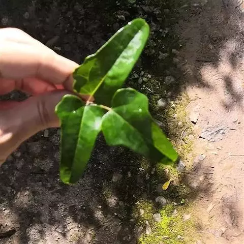 叶片椭圆形,长约4.6~6.7厘米,宽约2.1~3.6厘米,长是宽的约1.8~2.2倍。翼叶细小,叶柄短,叶脉不明显。叶缘浅波状或全缘,叶尖钝或微尖凹。新叶淡绿色,老叶深绿色。
