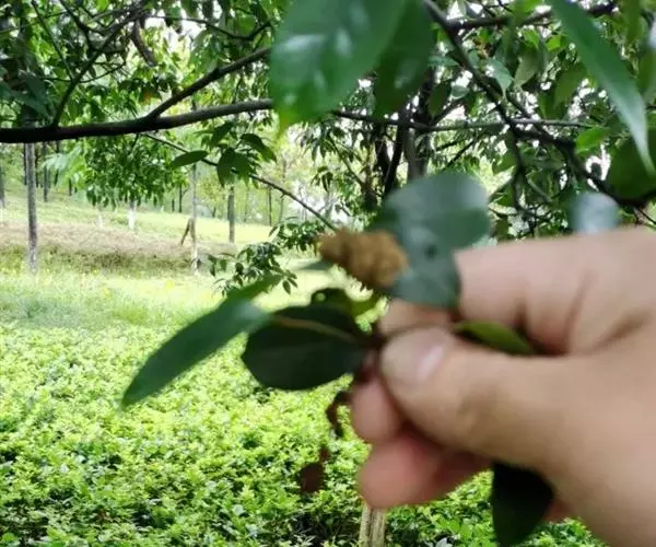 叶革质或厚革质,二年生,倒卵状矩圆形,长7-13厘米,宽3-4.5厘米;先端短急尖,有时略钝,基部楔形;上面深绿色,干后稍发亮;下面浅绿色,无毛;侧脉约7对,在上下两面均突起,网状小脉在上面很明显,在下面稍突起,边缘有钝锯齿,叶柄长约1厘米,无毛,稍粗壮;托叶细小,早落。