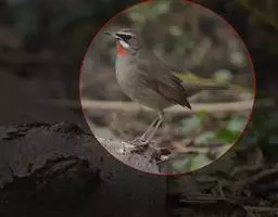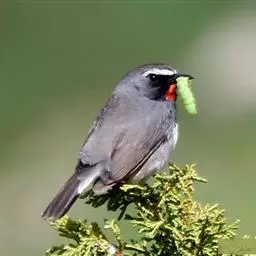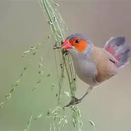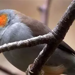 橙颊梅花雀体长约10厘米,头部灰色,两侧有大块橙色区域,嘴基及眼下方有黑纹,两条黑纹间呈白色,…