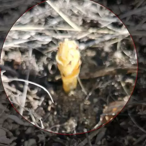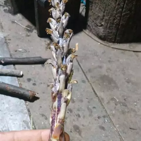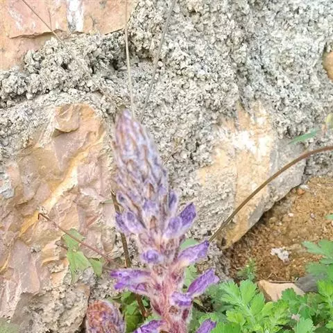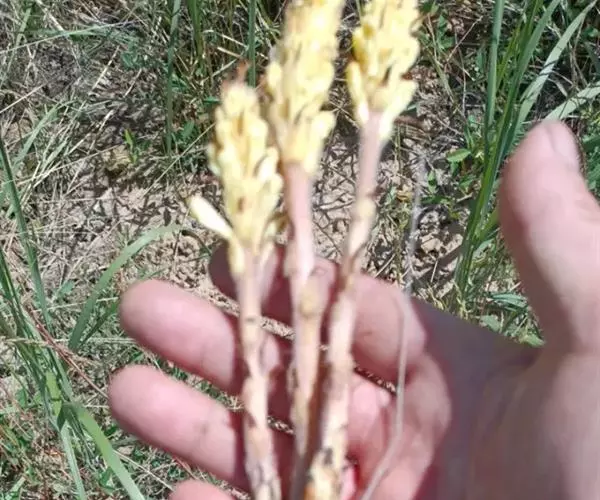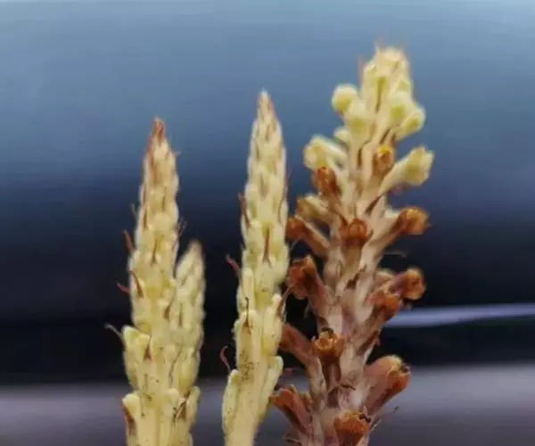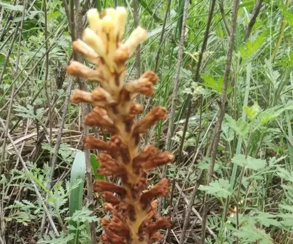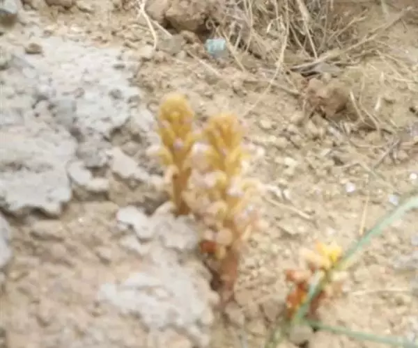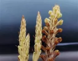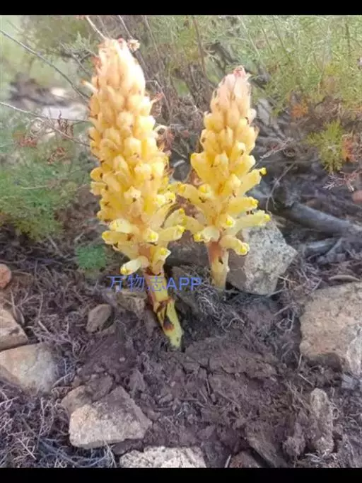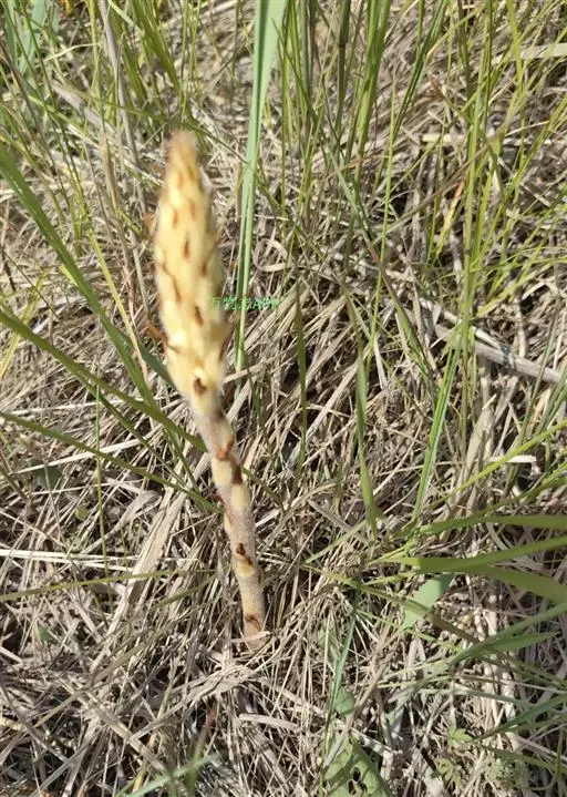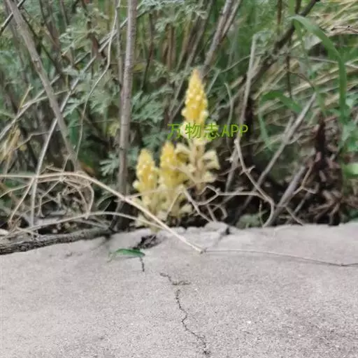 【特征】: 一年生寄生草本。株高10-34厘米,植株密被腺毛。茎直立,常不分枝,圆柱形,基部常膨大,黄褐色。叶为鳞片状、卵状披针形。