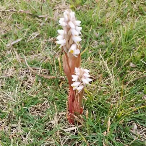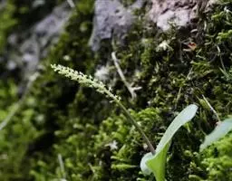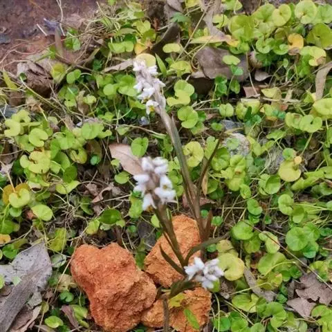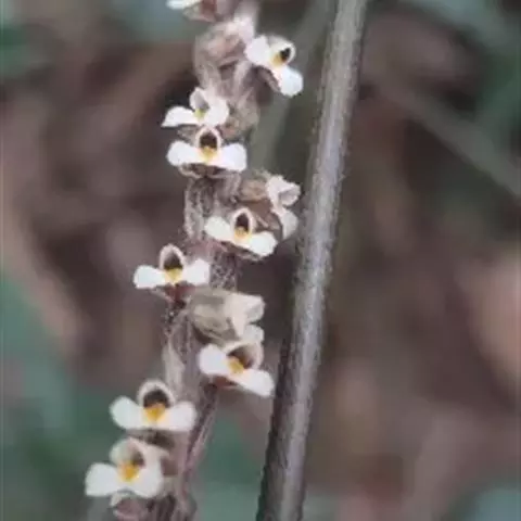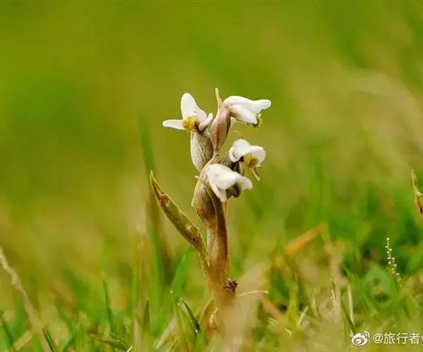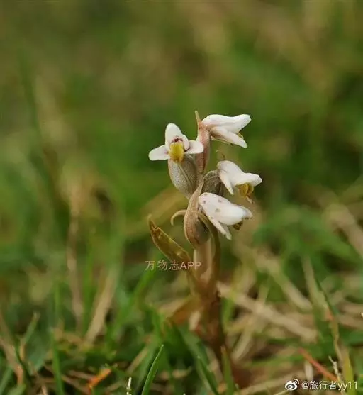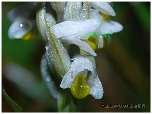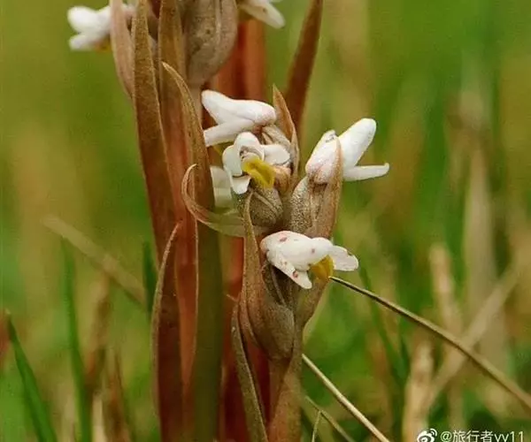 总状花序几乎无花序梗,具几朵至20余朵密生的花,长2-5厘米,花序轴无毛或有毛;花苞片卵状披针形,红褐色,长8-12毫米,先端长渐尖,长于花,背面无毛或有毛;子房椭圆状圆柱形,扭转,无毛或有毛,连花梗长5-6毫米;花小,白色或黄白色;萼片背面无毛或有毛;中萼片狭卵状长圆形,凹陷,长4-5.5毫米,宽2-2.5毫米,先端钝,具1脉,与花瓣粘合呈兜状;侧萼片偏斜的长圆形,长4-5毫米,宽1.8-2毫米,先端急尖,具1脉。