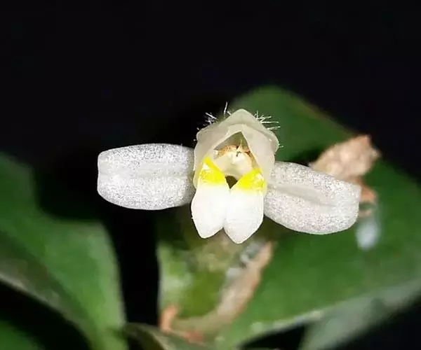 花瓣歪斜,半卵形或近镰状,与中萼片等长,宽1.5-1.8毫米,先端钝,具1脉,无毛;唇瓣肉质或较薄,舟状,淡黄色或黄色,基部凹陷呈囊状,其内面两侧各具1枚近三角形的胼胝体,中部收狭成长约0.5毫米、中央具沟痕的短爪,前部稍扩大,横椭圆形,长2毫米,宽约1.4毫米,顶端圆钝,稍凹陷或具稍微突起。