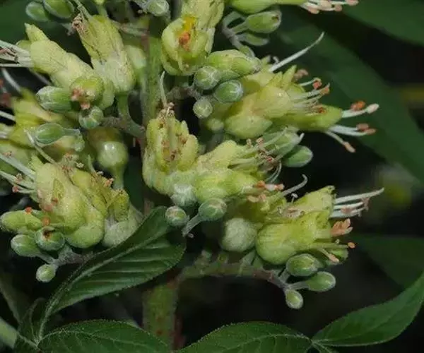 落叶乔木,高6-12米,宽度同高度几等,圆形树冠。树皮灰色,皱裂、小块裂或鳞片状裂。小枝粗壮,枝、叶搓碎后有臭昧。顶芽比侧芽大,有褐色鳞片包裹。直根发达。掌状复叶对生,5小叶,也有7小叶,小叶椭圆形或卵形,长7.5-15厘米,宽2.5-5.5厘米,具细锯齿,叶柄长7.5-15厘米。圆锥花序顶生,长10-17.5厘米,花萼橙色,花瓣黄绿色,花期4-5月。新果倒宽卵形,长2.5-5厘米,散生小刺,10月成熟,种子有毒。