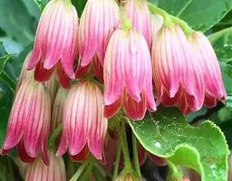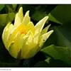 花白色,杯状,直径6厘米。花蕾绿色桃形。萼片4枚,背面绿色,正面白色。花瓣数22,雌雄蕊金黄色。花柄绿色,着生有茸毛。叶子马蹄形,正面绿色,背面棕红色,叶径19×19厘米。叶柄绿色,着生有茸毛。