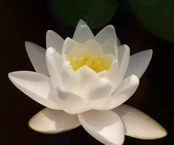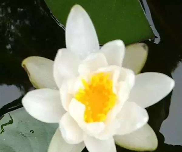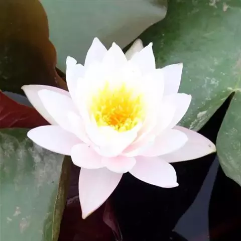 花瓣白色,花径2.5厘米,花萼淡绿白色,花药金黄色,雄蕊金黄色。花瓣及花萼数各为8-12及4。幼叶紫绿色,背面颜色稍浅于成叶;成叶铜绿色,叶缘红色,背面铜红色,脉纹明显。叶椭圆形,叶基“V”字形开裂,裂片契形,先端圆钝。叶长5×9厘米,叶展40-60厘米。评述:这是一个最小型的白花耐寒睡莲品种。能结实,果实为浆果,近球形,黑褐色种子发芽率较高。适合盆、桶栽及小型水池栽植。