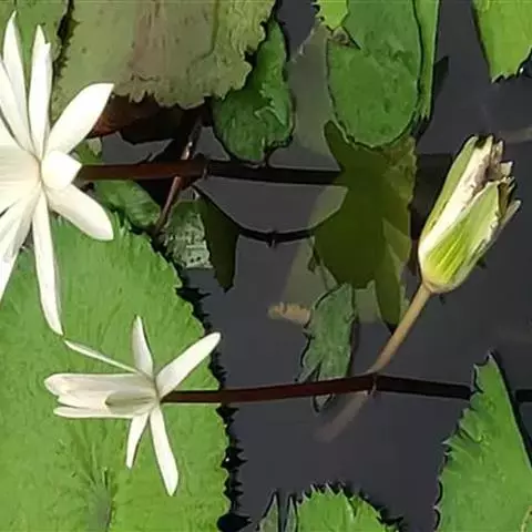 花白色,星形,直径11-14厘米,花朵挺水。萼片背面绿色,正面白色。花瓣细长,尖端出现裂缺。雄雌蕊均为黄色。萼片数4,花瓣数25-27。花梗绿色,着生有茸毛。叶卵形,叶表绿色,背面红褐色,有紫色斑点,叶径21×19厘米,叶展1.5-2m。叶柄绿色,着生有茸毛。