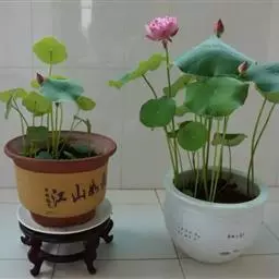 盆栽 每年春分前后,在花盆底部放入腐熟的豆饼或骨粉、蹄片等肥料,上面放入30厘米以上肥沃河泥。然后将带有芽眼的根栽入河泥中,覆土没过顶芽,然后在盆中或缸中加水。高温季节及时换水,以免藻类的产生而影响其美观。