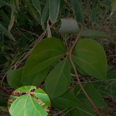 落叶木质藤本,长达到10余米。藤径粗达9厘米,全株无毛;当年枝条暗红色,老树皮有时纵裂。三出复叶,或兼具单叶,稀全部为单叶;叶柄长与3-12厘米;小叶革质,顶生小叶近棱状倒卵圆形,长4-12.5厘米,宽3-9厘米,先端急尖,基部渐狭成6-15毫米的短柄,全缘,侧生小叶斜卵形,先端急尖,基部内面楔形,外面截形或圆形,上面绿色,下面淡绿色,干时常变为红褐色,比顶生小叶略大,无小叶柄。