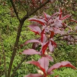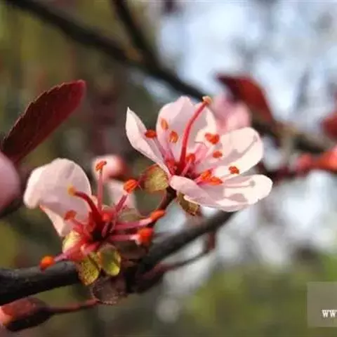 美人梅是蔷薇科李属的落叶小乔木。叶互生,呈广卵形或卵形,紫红色;花呈淡紫红色,半重瓣或重瓣,花叶同放,…