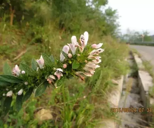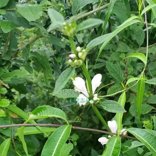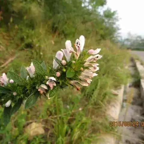 轮伞花序腋生,多花,远离而向顶密集组成长穗状;小苞片少数,刺状,直伸,长5-6毫米,基部相连接,具糙硬毛,绿色;花梗无。 花萼管状,长7-8毫米,外面被微硬毛,沿脉上被长硬毛,其间混有淡黄色腺点,中部以上均绿色,中部以下渐近基部毛被疏少而呈草黄色,内面无毛,脉5,除近基部外明显突出,齿5,前2齿靠合,较大,长5毫米,直伸,钻状,先端刺尖,后3齿较小,均等大,长3毫米,直伸,三角状钻形,先端刺尖。 花冠白色,常带紫纹,长1.8厘米,冠筒长约8毫米,外面在中部以下无毛,中部以上被疏柔毛,内面在上部被短柔毛,中部具近水平向的鳞状毛毛环,其下方无毛,冠檐二唇形,上唇长圆状卵形,先端近圆形,基部略收缩,长达1厘米,直伸,稍内凹,全缘,白色,外被疏柔毛,内面无毛,下唇轮廓为卵形,长约8毫米,宽约5毫米,白色,具紫纹,3裂,外被疏柔毛,内面无毛,中裂片较大,倒心形,先端微凹,明显2小裂,侧裂片卵圆形。 雄蕊4,均延伸至上唇片之下,前对较长,花丝丝状,扁平,具紫斑,中部以下或近基部有微柔毛,花药卵圆形,2室。花柱丝状,先端相等2浅裂。花盘平顶。子房褐色,无毛。
