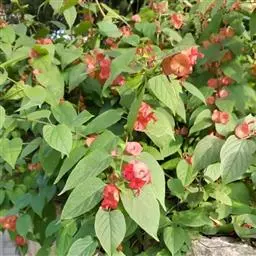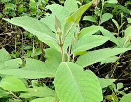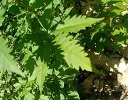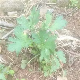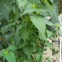 叶片变异很大,最下部的叶通常脱落,近茎基部叶轮廓为卵圆形,长6-7厘米,宽4-5厘米,3裂,分裂达中部,裂片几相等,边缘疏生粗锯齿状牙齿,先端锐尖,基部宽楔形,近革质,上面暗绿色,稍密被糙伏小硬毛,粗糙,叶脉下陷,具皱纹,下面淡绿色,主沿脉上有贴生的小硬毛,其间散布淡黄色腺点,叶脉明显凸起,叶柄长1-2厘米,多少具狭翅,腹面具槽,背面圆形,密被小硬毛;茎中部的叶通常不裂,轮廓为长圆形,边缘疏生4-5对齿,最下方的一对齿多少呈半裂片状,其余均为锯齿状牙齿,叶柄较短,长在1厘米以下;花序上的苞叶最小,近于线状长圆形,长3厘米,宽1厘米,全缘,或于先端疏生1-2齿,无柄。