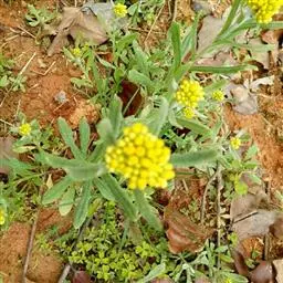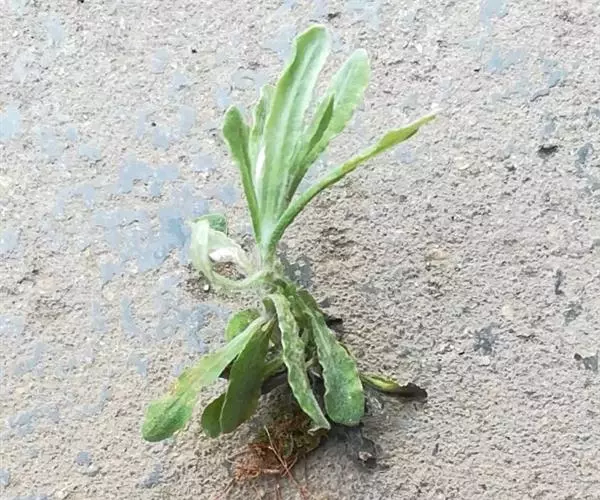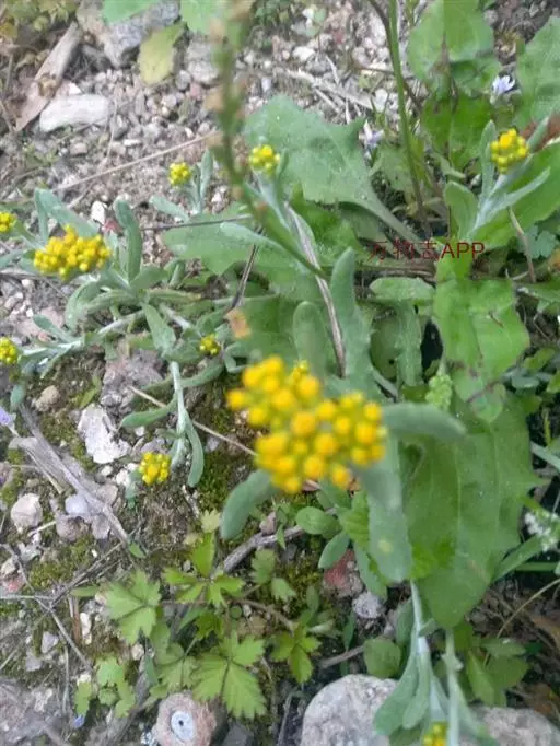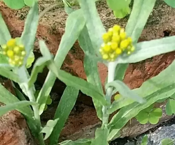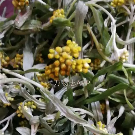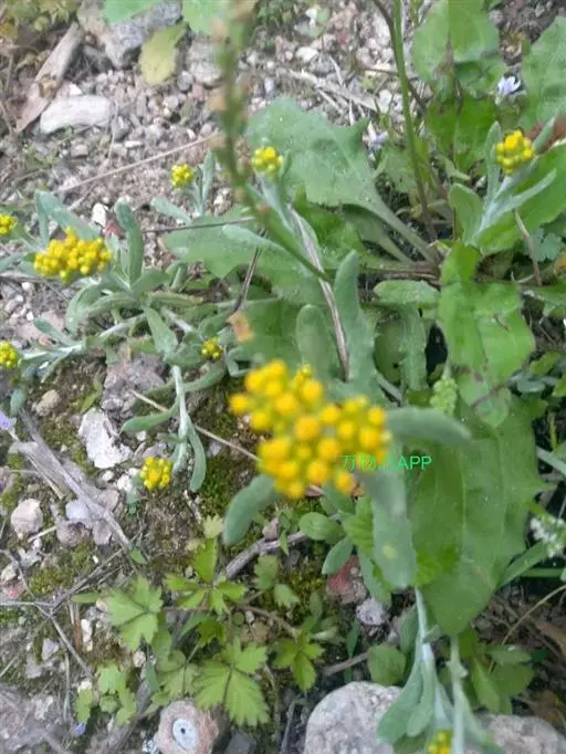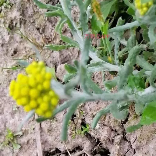 一年生草本。茎直立或基部发出的枝下部斜升,高10-40厘米或更高,基部径约3毫米,上部不分枝,有沟纹,被白色厚棉毛,节间长8-20毫米,上部节间罕有达5厘米。叶无柄,匙状倒披针形或倒卵状匙形互生,长5-7厘米,宽11-14毫米,上部叶长15-20毫米,宽2-5毫米,基部渐狭,稍下延,顶端圆,具刺尖头,两面被白色棉毛,上面常较薄,叶脉1条,在下面不明显。头状花序较多或较少数,径2-3毫米,近无柄,在枝顶密集成伞房花序,花黄色至淡黄色;总苞钟形,径约2-3毫米;总苞片2-3层,金黄色或柠檬黄色,膜质,有光泽,外层倒卵形或匙状倒卵形,背面基部被棉毛,顶端圆,基部渐狭,长约2毫米,内层长匙形,背面通常无毛,顶端钝,长2.5-3毫米;花托中央稍凹入,无毛。雌花多数,花冠细管状,长约2毫米,花冠顶端扩大,3齿裂,裂片无毛。两性花较少,管状,长约3毫米,向上渐扩大,檐部5浅裂,裂片三角状渐尖,无毛。瘦果倒卵形或倒卵状圆柱形,长约0.5毫米,有乳头状突起。冠毛粗糙,污白色,易脱落,长约1.5毫米,基部联合成2束。花期1-4月,8-11月。