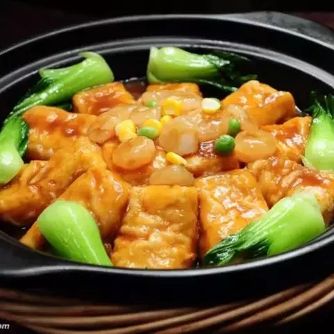 豆腐煲是一道美味可口的名肴,属于粤菜系。主料:北豆腐、蟹味菇、瑶柱、鲜茶树菇