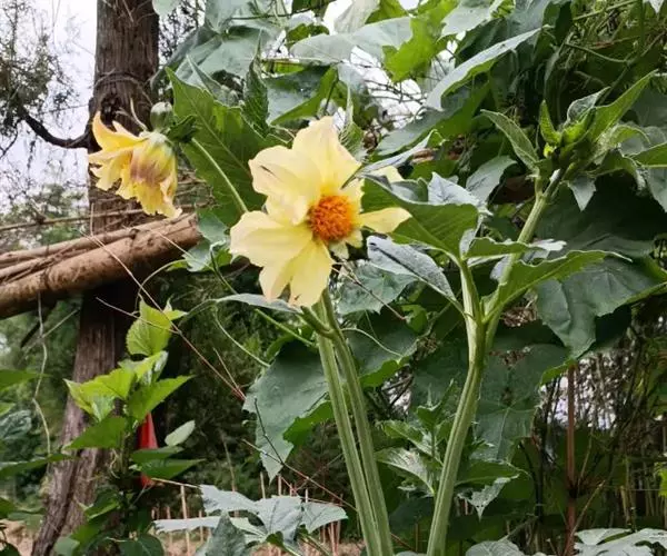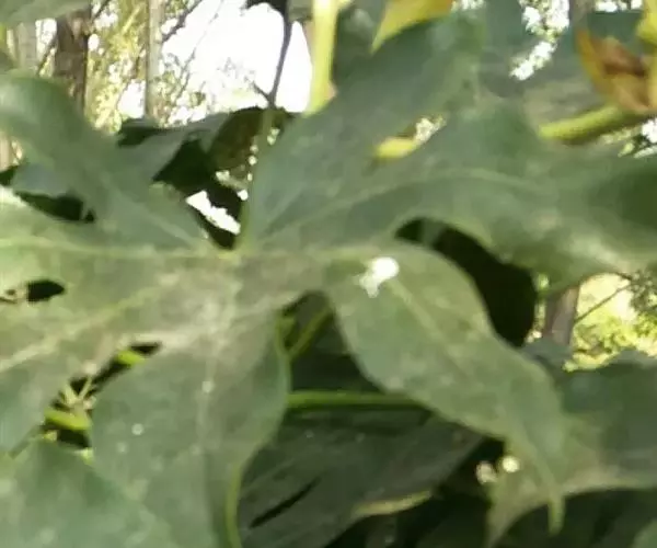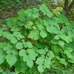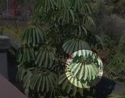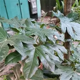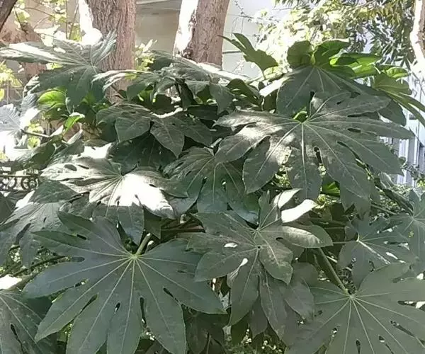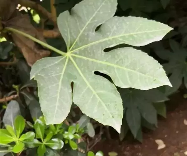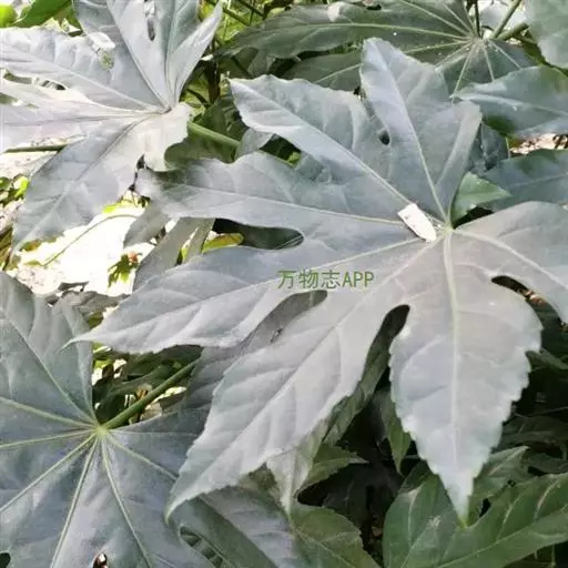 常绿灌木或小乔木,高可达5m。茎光滑无刺。叶柄长10-30cm;叶片大,革质,近圆形,直径12-30cm,掌状7-9深裂,裂片长椭圆状卵形,先端短渐尖,基部心形,边缘有疏离粗锯齿,上表面暗亮绿以,下面色较浅,有粒状突起,边缘有时呈金黄色;侧脉搏在两面隆起,网脉在下面稍显着。