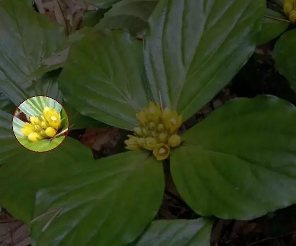 圆锥花序顶生,长20-40cm;伞形花序直径3-5cm,花序轴被褐色绒毛;花萼近全缘,无毛;花瓣5,卵状三角形,长2.5-3mm,黄白色,无毛;雄蕊5,花丝与花瓣等长;子房下位,5室,每室有1胚球;花柱5,分离;花盘凸起半圆形。果实近球形,直径5mm,熟时黑色。花期10-11月,果熟期翌年4月。