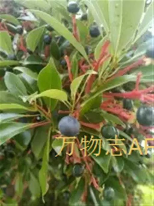 果扁球形,直径8-10毫米,初时绿色,后变黑紫色;果梗鲜红色。花期2月,果期7月。