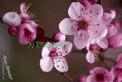 六、绛桃:花深红色,萼筒紫褐色,深皱有毛。花枝绿褐色。