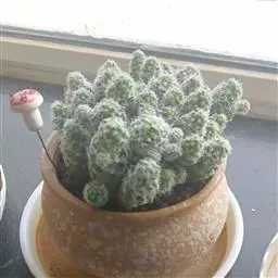 江守玉为仙人掌科强刺球属,植株扁圆形至球形,后成圆柱状,体色灰绿,刺座上附生白色绒毛,花橙黄色,漏…