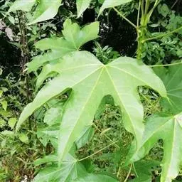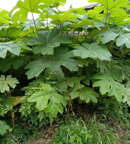 版本二: 常 绿灌木或小乔木,高1-3.5米,基部直径6-9厘米;树皮深棕色,略有皱裂;新枝淡棕色或淡黄棕色,有明显的叶痕和大形皮孔,幼时密生黄色星状厚绒毛,后毛渐脱落。叶大,集生茎顶;叶片纸质或薄革质,长50-75厘米,宽50-70厘米,掌状5-11裂,裂片通常为叶片全长的1/3或1/2,稀至2/3,倒卵状长圆形或卵状长圆形,通常再分裂为2-3小裂片,先端渐尖,上面深绿色,无毛,下面密生白色厚绒毛,边缘全缘或疏生粗齿,侧脉和网脉不明显;叶柄粗壮,长30-50厘米,无毛;托叶和叶柄基部合生,锥形,长7.5厘米,密生淡棕色或白色厚绒毛。圆锥花序长50厘米或更长;分枝多,长15-25厘米;苞片披针形,长1-3.5厘米,密生白色或淡棕色星状绒毛;伞形花序直径1-1.5厘米,有花多数;总花梗长1-1.5厘米,花梗长3-5毫米,均密生白色星状绒毛;小苞片线形,长2-6毫米;花淡黄白色;萼长1毫米,边缘全缘或近全缘,密生白色星状绒毛;花瓣4,稀5,三角状卵形,长2毫米,外面密生星状厚绒毛;雄蕊和花瓣同数,花丝长约3毫米;子房2室;花柱2,离生,先端反曲。果实直径约4毫米,球形,紫黑色。花期10-12月,果期次年1-2月。