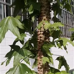 版本一:五加科常绿灌木或小乔木,高1-3.5m。茎粗壮,不分枝,幼稚时表面密被黄色星状毛或稍具脱落的灰黄色柔毛。茎贿大,白色,纸质;树皮深棕色,略有皱裂;新枝淡棕色或淡黄棕色,有明显的叶痕和大型皮孔。叶大,互生,聚生于茎顶;叶柄粗壮,圆筒形,长30-50cm;托叶膜质,锥形,基部与叶柄合生,有星状厚绒毛;叶片纸质或薄革质,掌状5-11裂,裂片通常为叶片全长的1/3-1/2,稀至2/3,倒卵状长圆形卵状长圆形,每一裂片常又有2-3个小裂片,全缘或有粗齿,上面深绿色,无毛,下面密被白色星状绒毛。伞形花序聚生成顶生或近顶生大型复圆锥花序,长达50cm以上;萼密被星状绒毛,全缘或近全缘;花瓣4,稀5,三角状卵形,长2mm,外面密被星状厚绒毛;雄蕊5,与花瓣同数;子房下位,2室,花柱2,离生,先端反曲。果球形,直径约4mm,熟时紫黑色。花期10-12月,果期翌年1-2月。