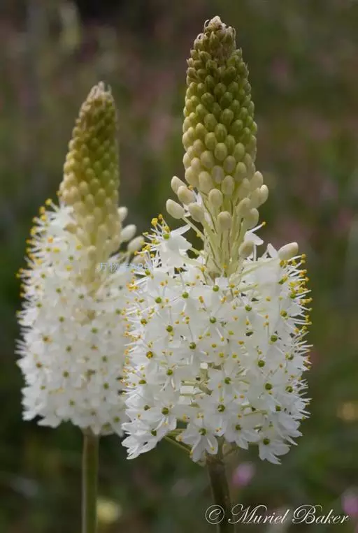 植株高60-120厘米。花极多,在花葶上形成稠密的长达30-40厘米的总状花序;苞片长8-10毫米(极少达20毫米),比花梗短,先端有长芒,无毛,有一条暗褐色脉;花被窄钟状;花梗长1.5-2-5厘米,上端有关节,倾斜开展;花被片长1-1.3厘米,白色,长椭圆形,长1-1.6(-2)厘米,有一脉;雄蕊短,藏于花被内。蒴果直径7-9毫米,表面常有皱纹,带绿黄色,熟时果柄近平展,果柄长2-2.5厘米。种子三棱形,有窄翅。花期6月,果期7月。