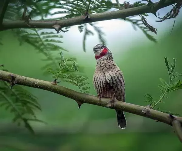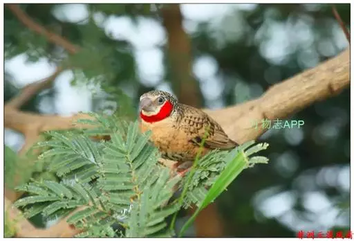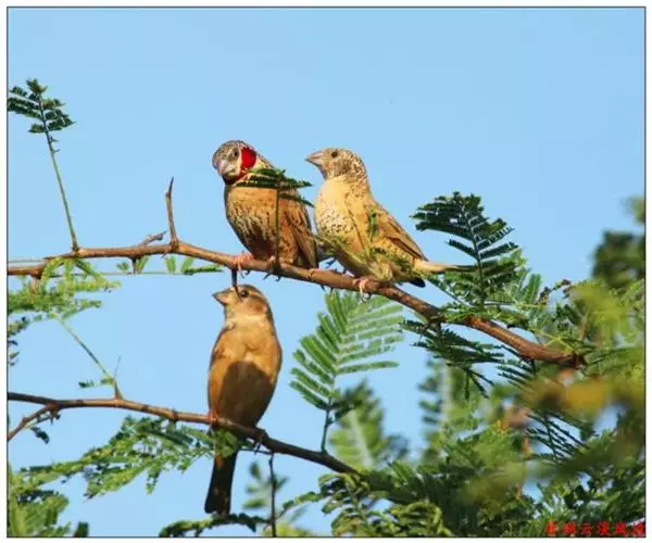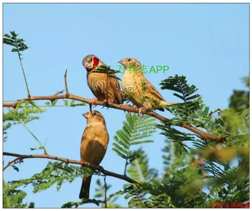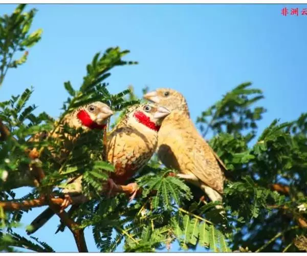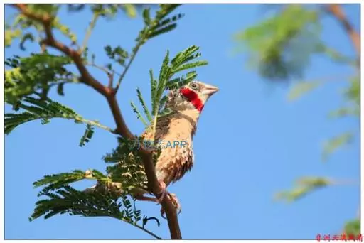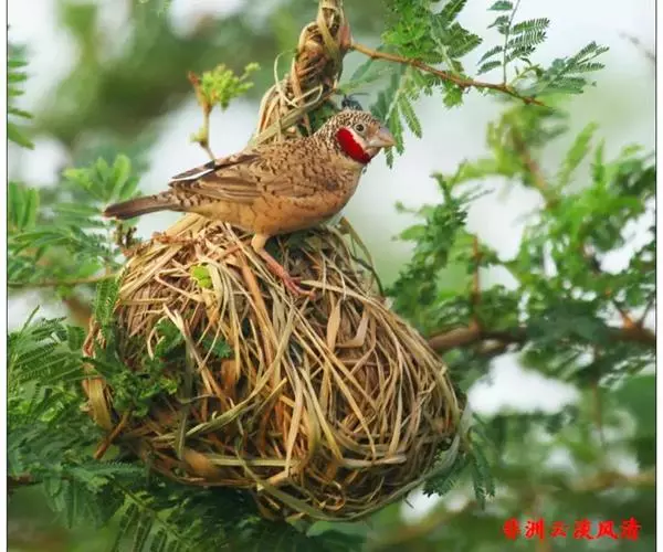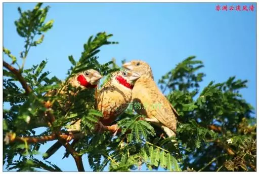 雄性成鸟具有红色候斑,分布于非洲的撒哈拉沙 漠以南地区。它们生活在热带草原及干燥林地中,以种子和昆虫为食。