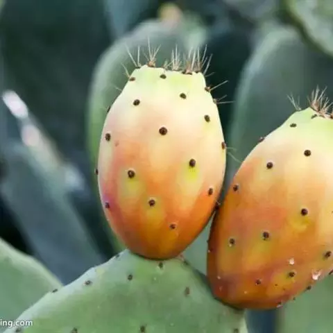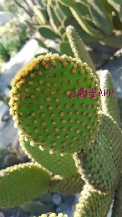 多年生多肉植物。 植株直立多分枝,灌木状,高60-100厘米。茎节呈较阔的椭圆形或广椭圆形,黄绿色。刺座密被金黄色钩毛。夏季开花,花淡黄色,短漏斗形。浆果圆形,红色,果肉白色。 黄毛掌