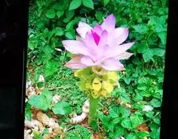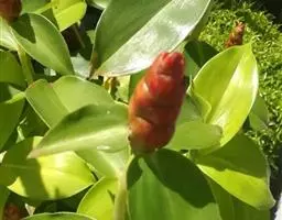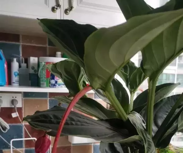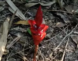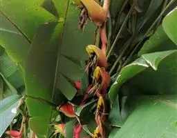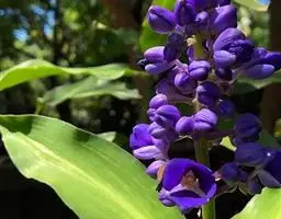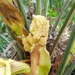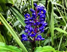 花数朵生于一约与叶柄等长或略短的总花梗上,下托一佛焰苞;佛焰苞舟状,长达20厘米,绿色,边紫红,萼片披针形,长7.5-10厘米,橙黄色,箭头状花瓣基部具耳状裂片,和萼片近等长,暗蓝色;雄蕊与花瓣等长;花药狭线形,花柱突出,柱头3。