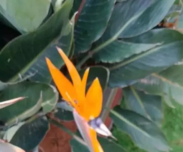 鹤望兰(Strelitzia reginae Aiton)旅人蕉科多年生草本植物,无茎。叶片长圆状披针形,长25-45cm,宽10cm。叶片顶端急尖;叶柄细长。花数朵生于总花梗上,下托一佛焰苞;佛焰苞绿色,边紫红,萼片橙黄色,花瓣暗蓝色;雄蕊与花瓣等长;花药狭线形,花柱突出,柱头3。花期在冬季。