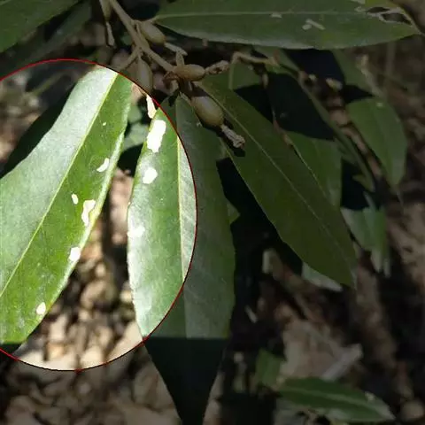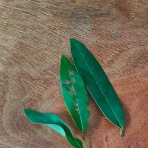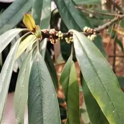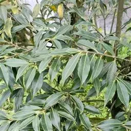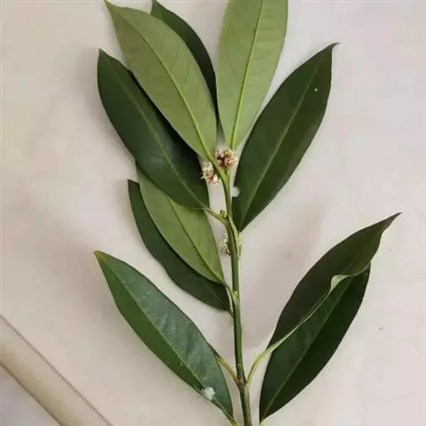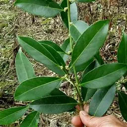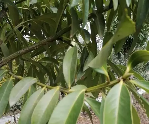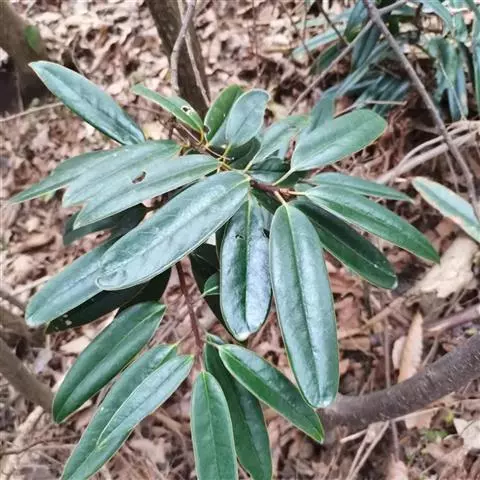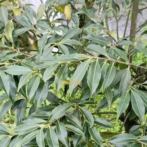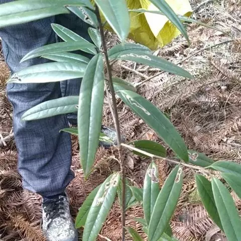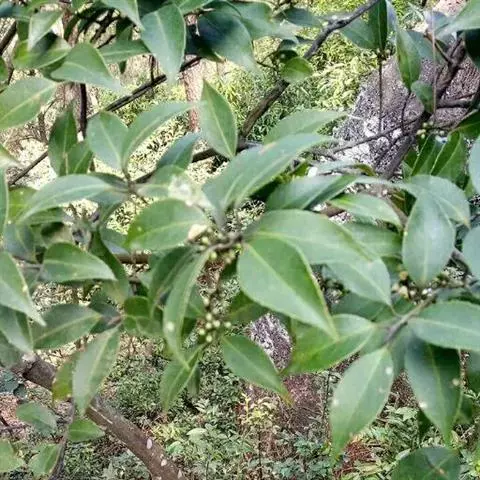 乔木。小枝黄绿色,粗壮,具4-5条棱。叶革质,狭椭圆形,长12-14厘米,宽3-5厘米,先端急尖,基部楔形,边缘具粗浅齿,两面均黄绿色;中脉在叶面凸起,侧脉每边9-14条,纤细,在叶面不明显,在叶背明显凸起;叶柄长约1厘米。