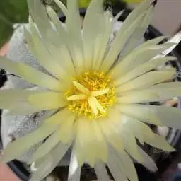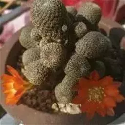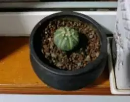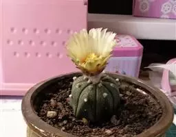 江守玉为仙人掌科强刺球属,植株扁圆形至球形,后成圆柱状,体色灰绿,刺座上附生白色绒毛,花橙黄色,漏…