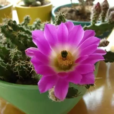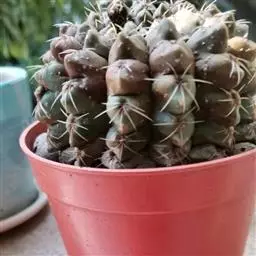 绯花玉 Speg.)是仙人掌科、裸萼球属多肉植物,植株呈扁球形,表皮墨绿色,刺针状,…