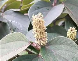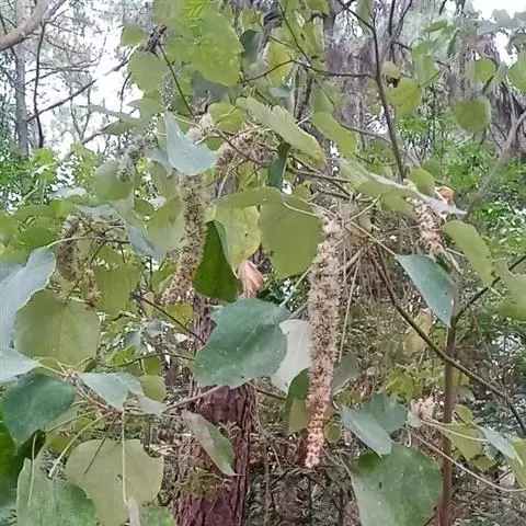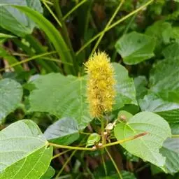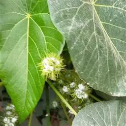 花雌雄异株;雄花序总状,顶生,长4-12厘米,苞片卵状披针形,长2-3毫米,雄花(1-)2-5朵簇生于苞腋,花梗长约3毫米;雄花:花蕾卵形,长约1.5毫米,花萼裂片3枚,阔卵形,不等大,长约1.5毫米,无毛;雄蕊25-45枚,药隔宽。雌花序总状,顶生,长7-10厘米,苞片钻形,长约2毫米,被毛,花梗长约2.5毫米;雌花:花萼佛焰苞状,长约4.5毫米,一侧开裂,顶端3齿裂,外面被星状毛和疏生黄色颗粒状腺体;子房球形,密生软刺和微柔毛,花柱中部以下合生,柱头长4-5毫米,密生羽毛状突起。蒴果扁球形。直径约1.4厘米,具3个分果爿,具3纵槽,被微柔毛和橙黄色颗粒状腺体,疏生稍弯的软刺;种子球形,直径约5毫米,具斑纹。花期2-4月,果期6-11月。