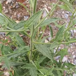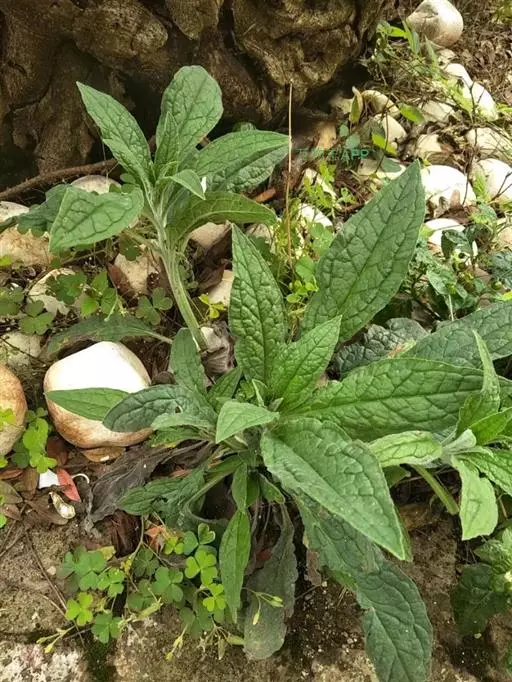 茎直立,中空,具肋棱,由上部分枝,分枝开展,被向下贴伏的柔毛。基生叶和茎下部叶长圆状披针形或披针形,长7-15厘米,宽2-4厘米,先端钝或渐尖,基部渐狭成柄,灰绿色,上下面均密生贴伏的短柔毛;茎中部及上部叶无柄,狄披针形,被灰色短柔毛。