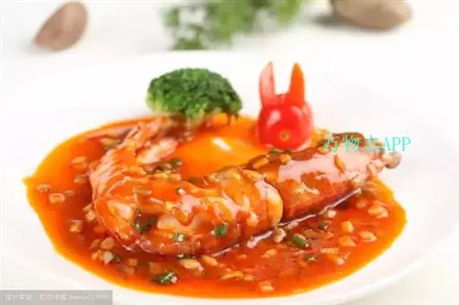 (5)大明虾装盆,芦笋和土豆球摆放在盆内,将奶油明虾汁淋在虾上即可。