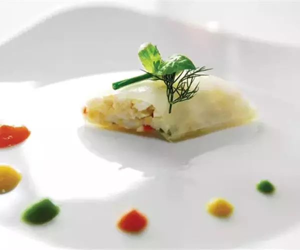 (3)土豆球焯水后煎熟至色金黄;芦笋焯水后用黄油、洋葱末翻炒,加盐、胡椒调味。